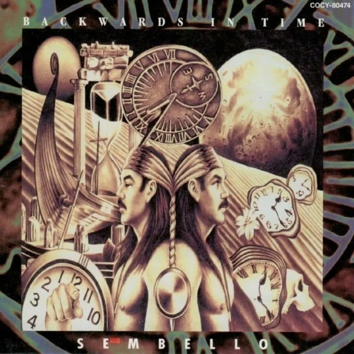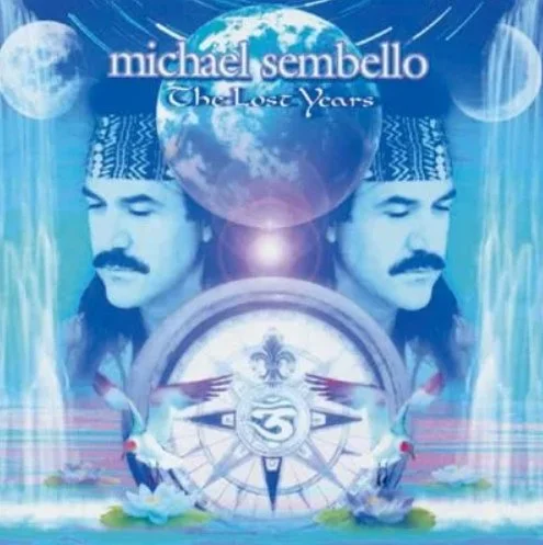 Album cover for Michael Sembello's 'The Lost Years' featuring portrait of Michael Sembello, a globe, a compass, and swans with water lilies against a blue background.
