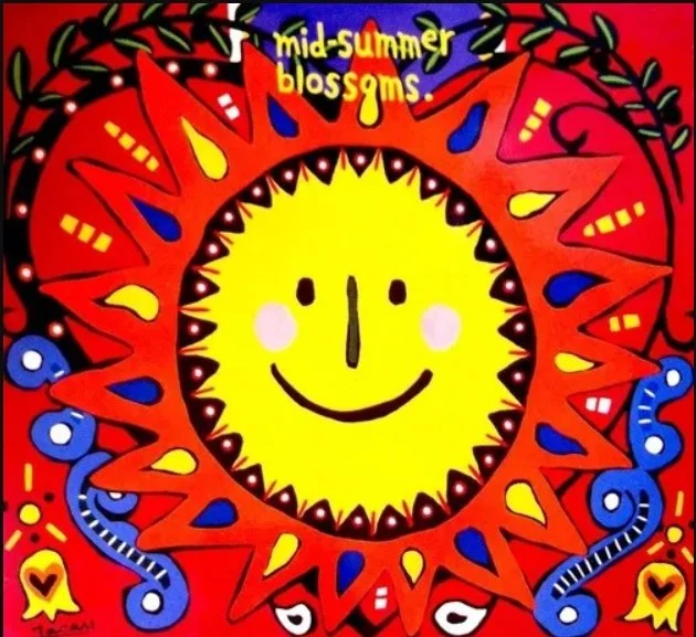 Colorful illustration of a smiling sun with a yellow face, pink cheeks, and a cheerful expression, surrounded by red flames, blue and yellow accents, with the words "Mid-Summer Blossoms" at the top.